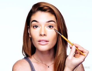 Bước 2:Sử dụng cọ mềm để chấm đều kem che khuyết điểm lên vùng da dưới mắt theo hình bán nguyệt.